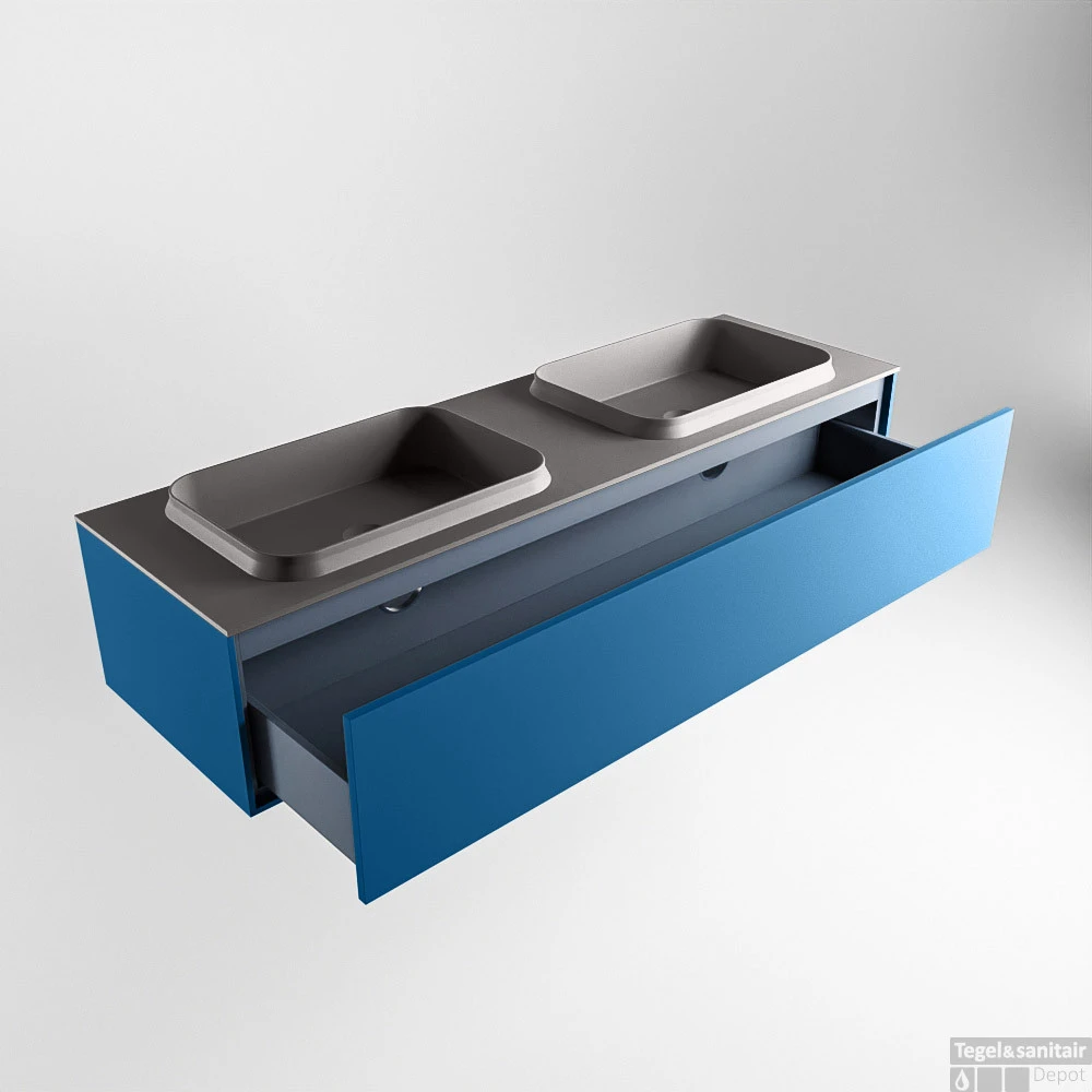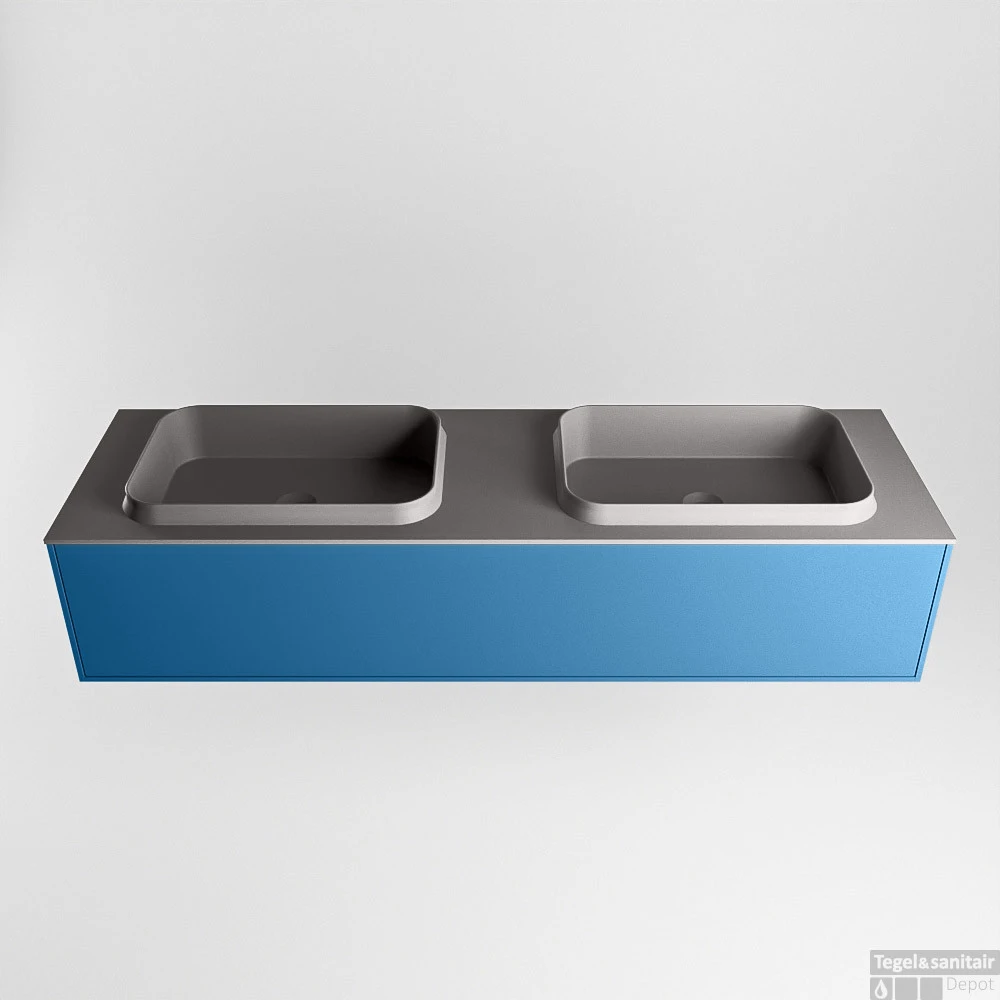 Badkamermeubelset Mondiaz Erin 150 cm met 1 Lade met RIDGE Wastafel Dubbel Dark grey Zonder Kraangaten Greeploos Mat Jeans