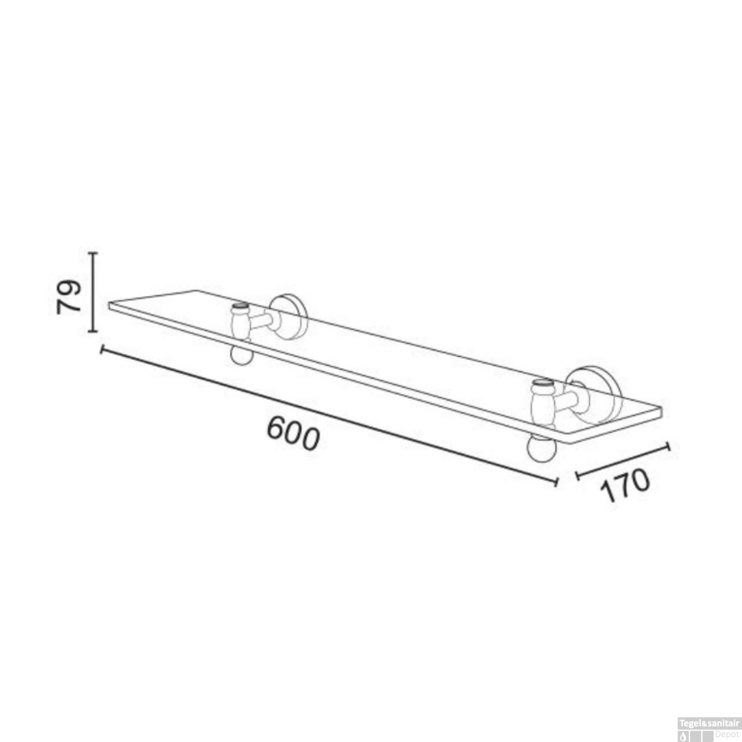 Het product heeft een afmeting van 60 x 7.9 x 17 cm (BxHxD) en is gemaakt van messing in de kleur goud met een plankje van helder glas.