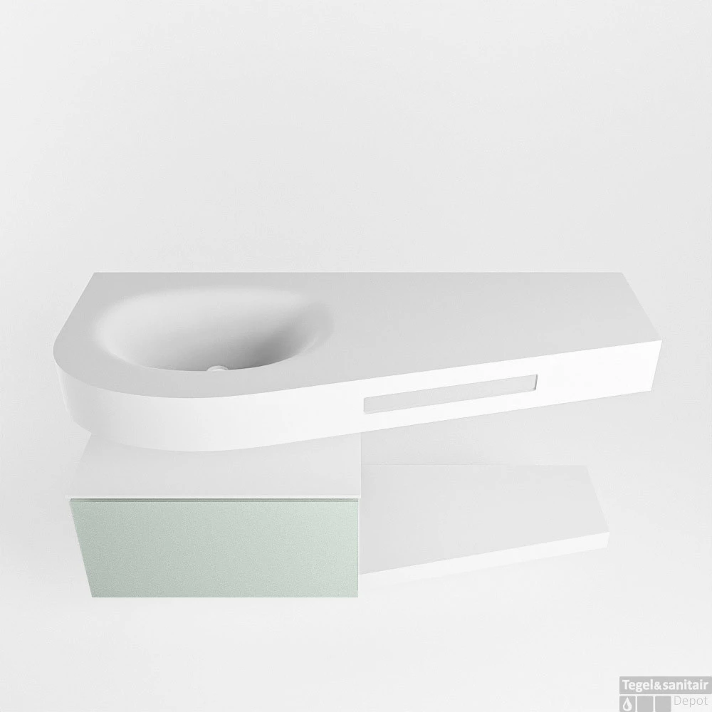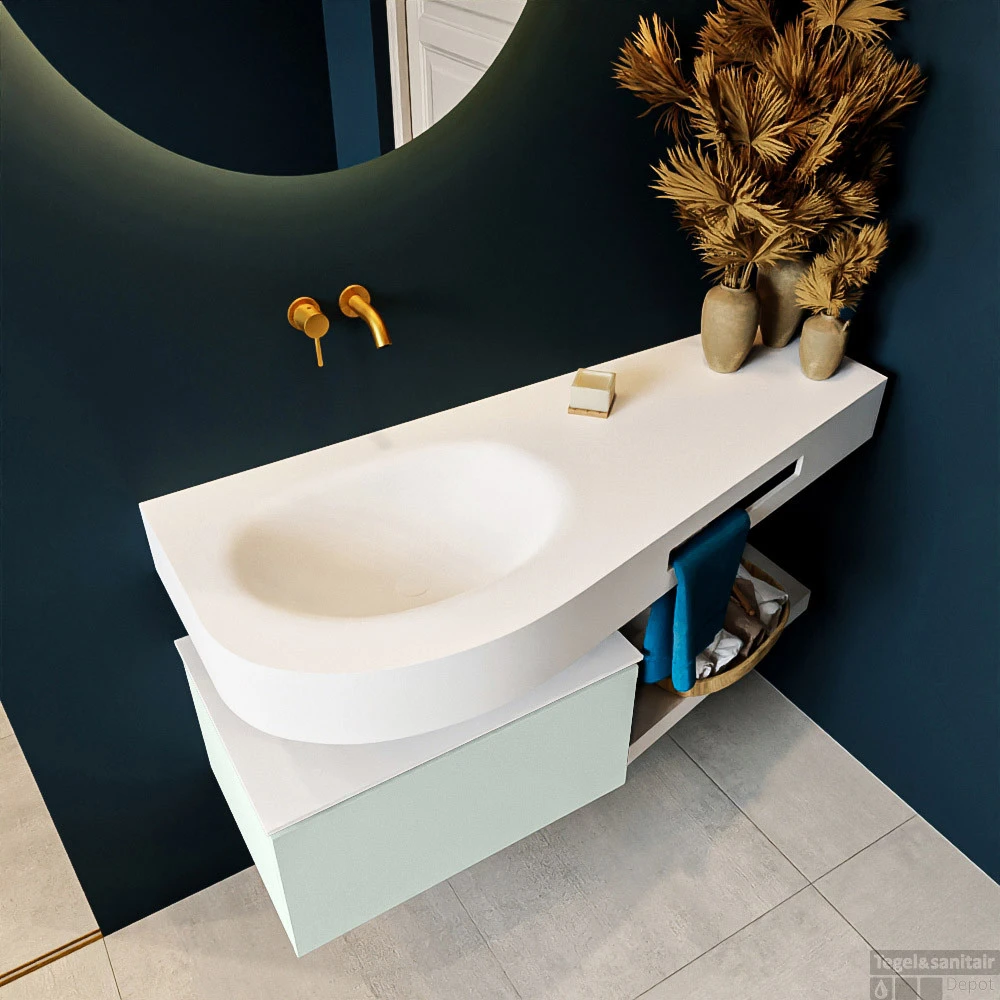 Deze set staat niet alleen mooi in een luxe hotelkamer maar kan ook een fantastische blikvanger zijn in uw badkamer. De speciale vorm van de wastafel DULCET en de geïntegreerde handdoek houder zorgen ervoor dat ook in de kleinere badkamer je kunt genieten van deze hotel chique uitstraling. De badmeubel in deze afbeeldingen is de RIVA 120cm badkamermeubel met onderkast in de kleur Greey. De RIVA heeft een vrij hangende onderkast met 1 lade waarin voldoende ruimte is voor uw badkamer spulletjes. Het solid surface planchet heeft dezelfde toelopende vorm als de wastafel. Het planchet geeft u ruimte om mooie badkamer producten te laten zien.